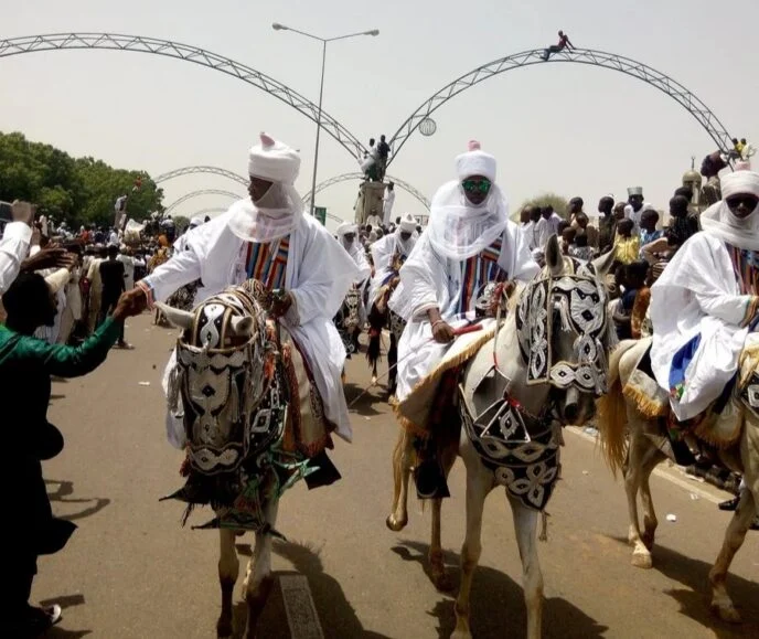 Durbar is a festival held during Eid-el-Kabir and Eid-el-Fitri celebrations. It begins with prayers, followed by a parade of the emir and his entourage on horses.